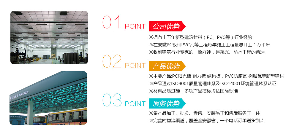 安徽天幕建材有限公司是一家專業從事PC陽光板,耐力板,結構板,防腐瓦,采光石,有機板等高分子建筑工程材料經銷批發和零售的公司,本公司從事板材和各類瓦銷售十多年,擁有完善的批發、零售、加工、工程設計、安裝施工、售后支持一條龍服務以及豐富的行業經驗,銷售網絡遍及安徽各地,經營代理多家品牌及自有品牌天幕系列的產品,是安徽地區首選的陽光板、耐力板經銷商...